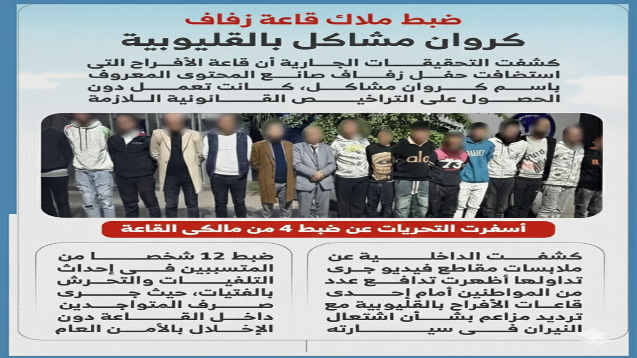 وجاء ذلك على خلفية تداول مقاطع مصورة عبر مواقع التواصل الاجتماعي، وثّقت حالة من التكدس والتدافع أمام إحدى قاعات الأفراح بمحافظة القليوبية، أثناء إقامة حفل زفاف أحد صناع المحتوى، بالتزامن مع ترديد أنباء عن اشتعال النيران في سيارة.
